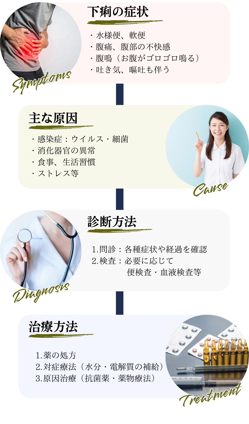 下痢とは、便が水っぽくなり回数が増える状態で、感染や食事、ストレスなどが原因となる消化管の異常です。