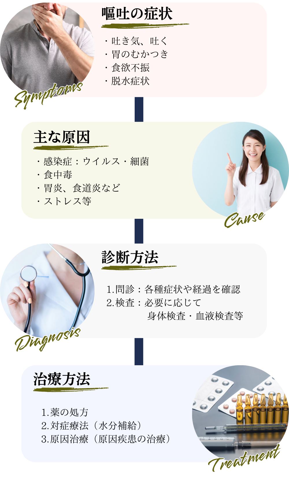 嘔吐とは、胃の内容物を口から強く吐き出す症状で、感染症や胃腸の不調、薬の影響などが原因となります。